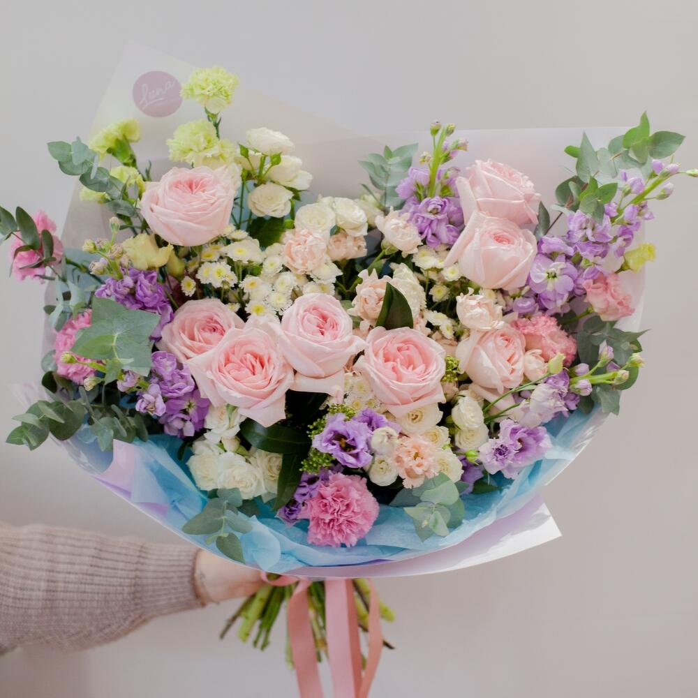 Хризантема сталион – 4 шт.Лизиантус – 5 шт.роза охара пионовидная – 8 шт.Маттиола – 4 шт.Диантус – 8 шт.Роза кустовая – 5 шт.Скиммия – 4 шт.Эвкалипт – 5 шт.Упаковка дизайнерская – 1 шт.