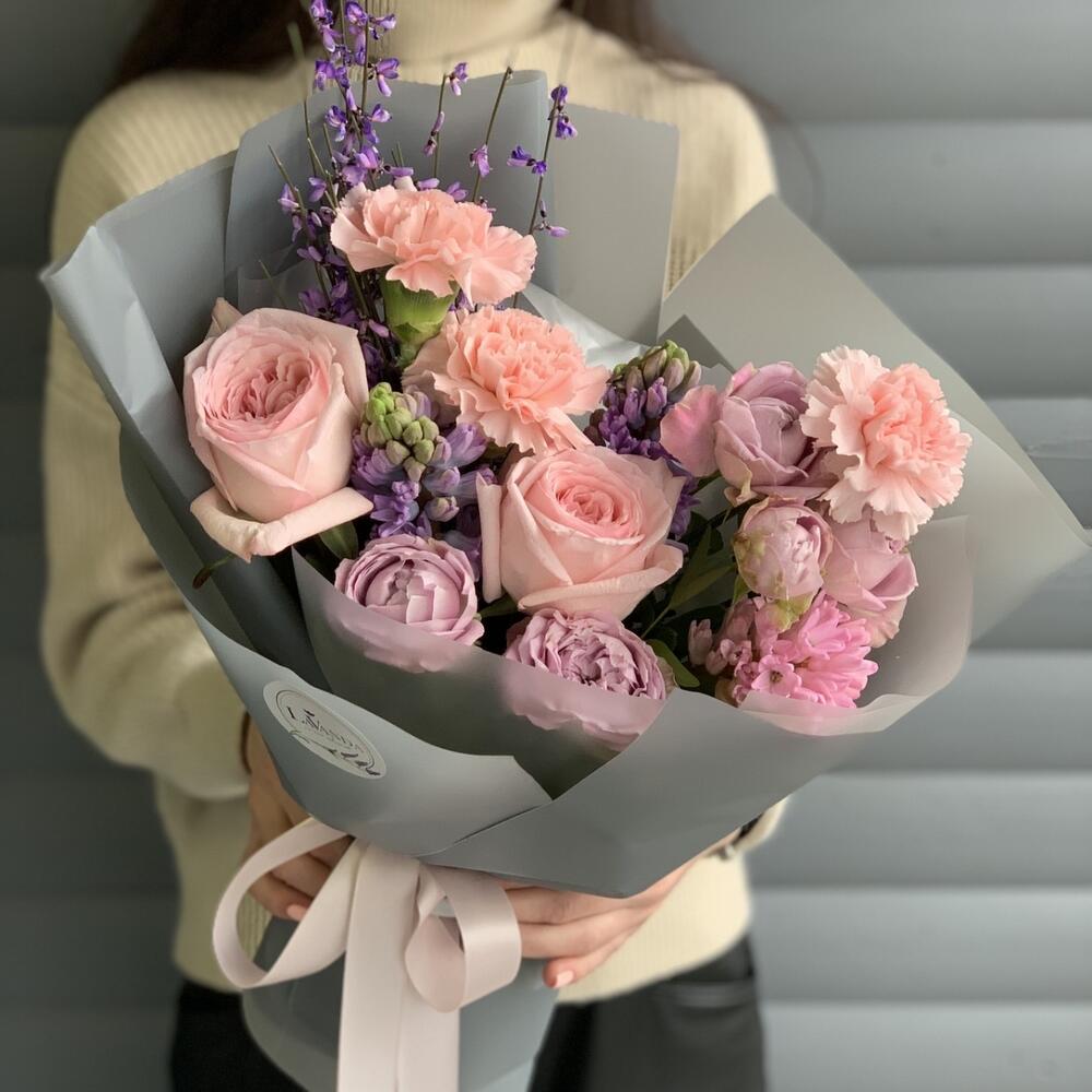 Гвоздики, Лизиантусы, Розы, Тюльпаны
