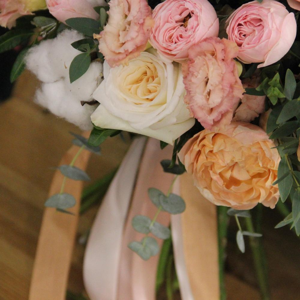 Роза пионовидная кустовая – 9 шт.Роза пионовидная – 7 шт.Лизиантус – 7 шт.хлопок коробка – 7 шт.Эвкалипт – 9 шт.Фисташка – 5 шт.Лента атласная – 2 шт.