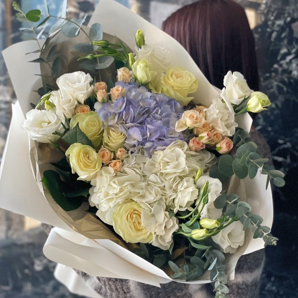 “Эвкалиптическая роскошь” гортензия и пионовидная кустовая роза