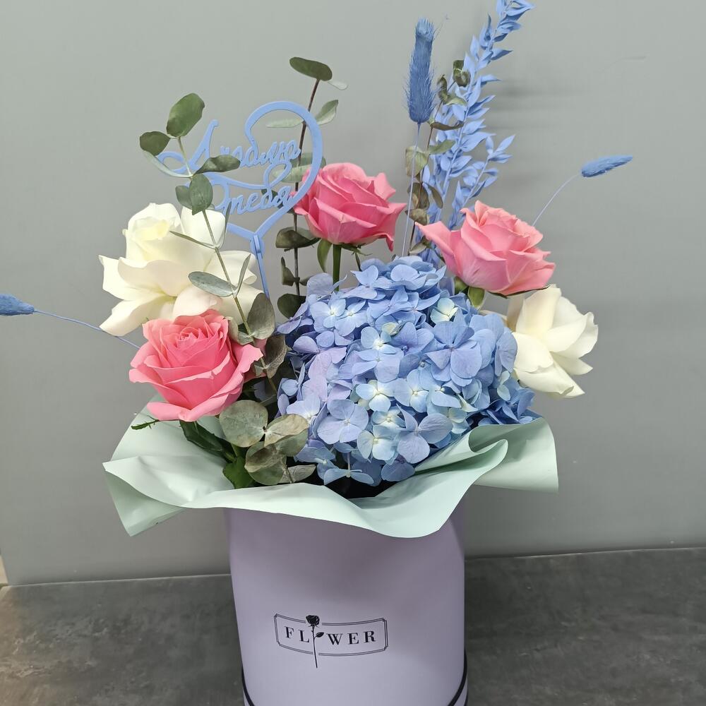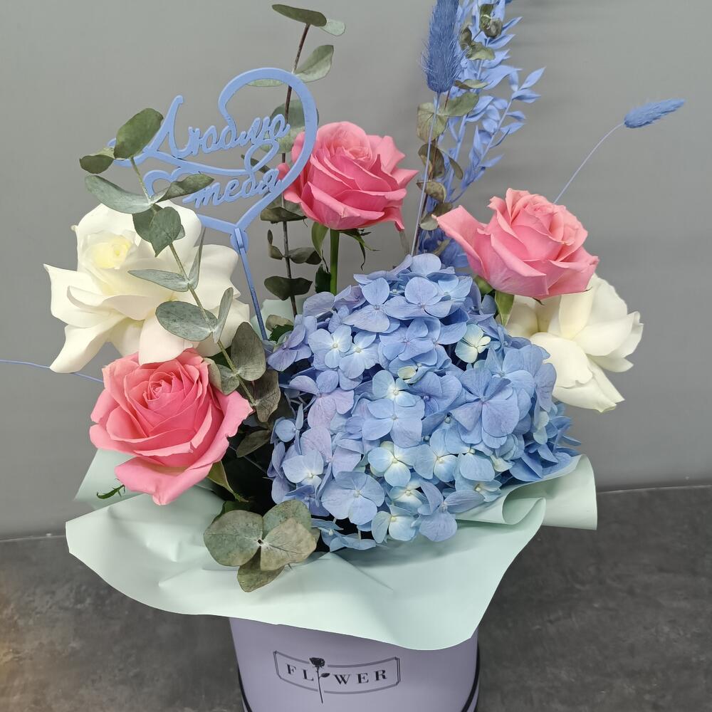 Гортензия – 1 шт. Сухоцветы – 1 шт. Открыточка с вашими пожеланиями – 1 шт. Голландская роза – 5 шт. Эвкалипт – 4 шт.