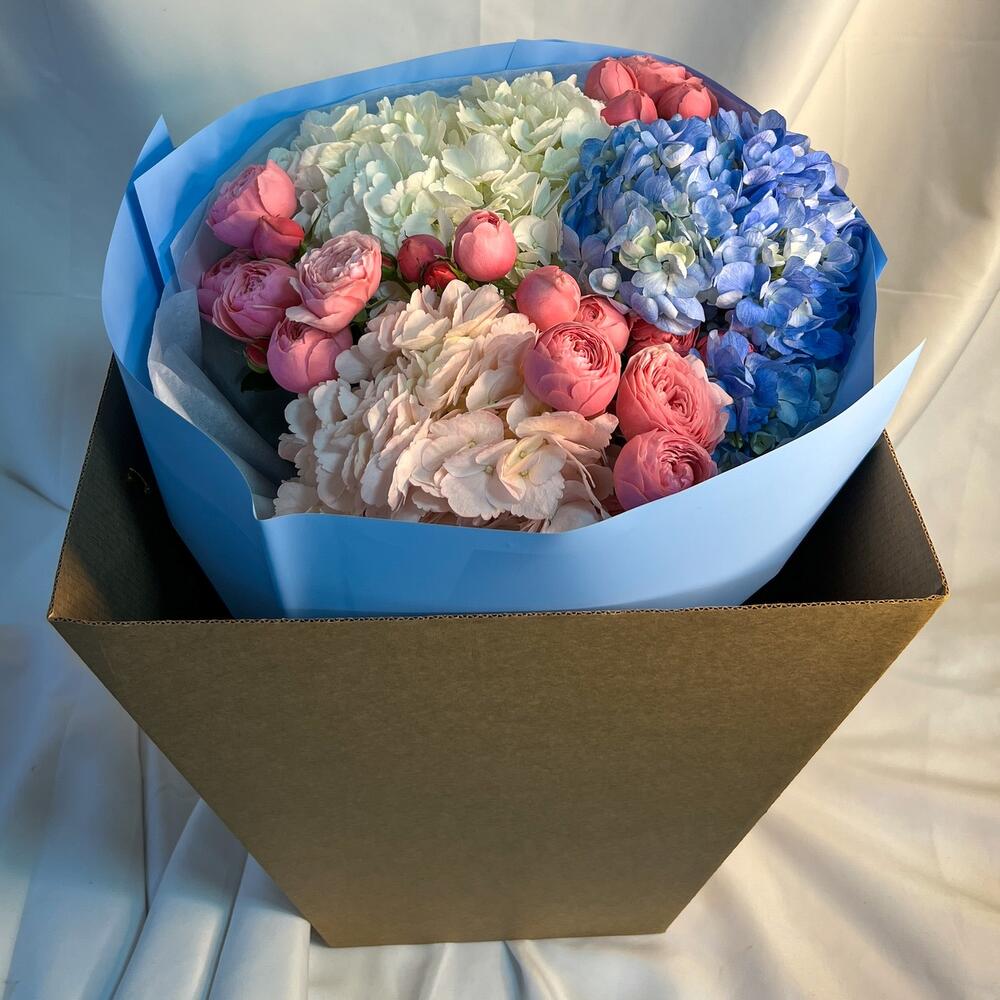 “Эвкалиптическая роскошь” гортензия и пионовидная кустовая роза