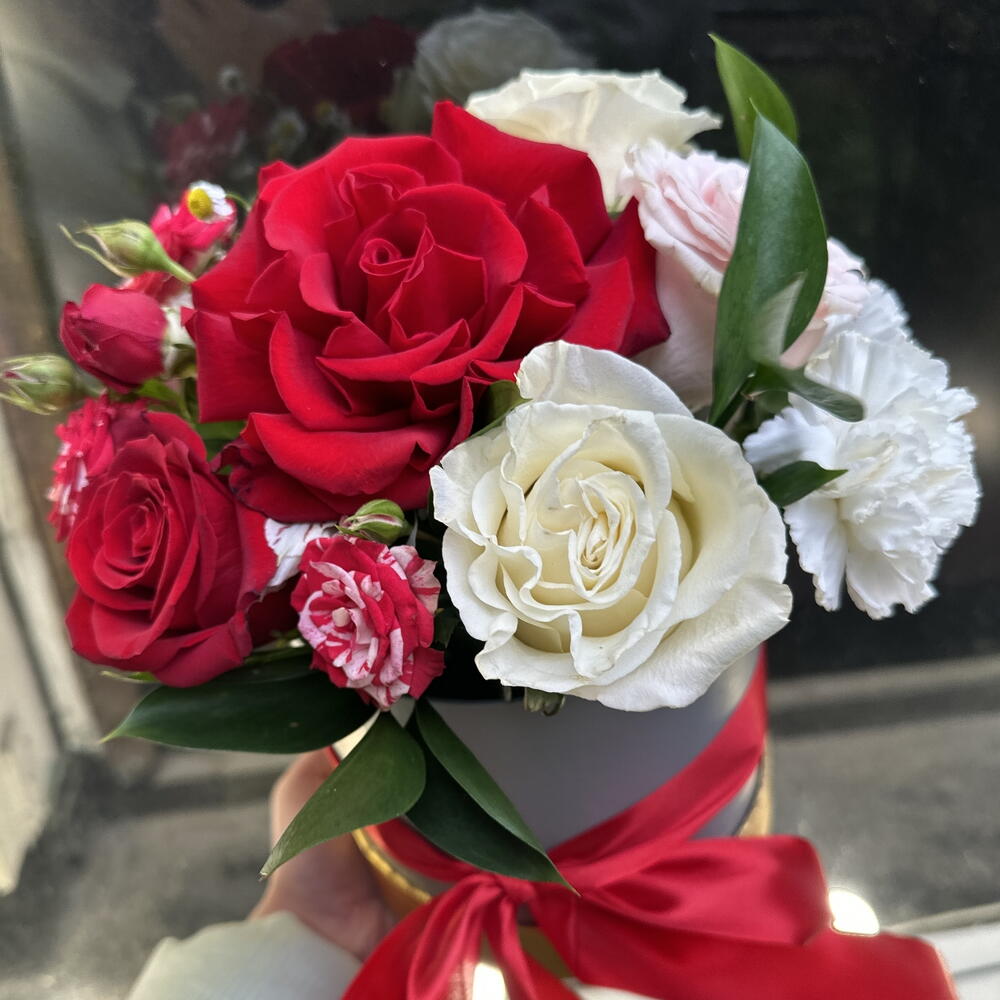 Роза – 4 шт. Кустовая роза – 2 шт. Зелень – 1 шт. Диантус – 2 шт. Коробка шляпная – 1 шт. французская красная роза – 1 шт.