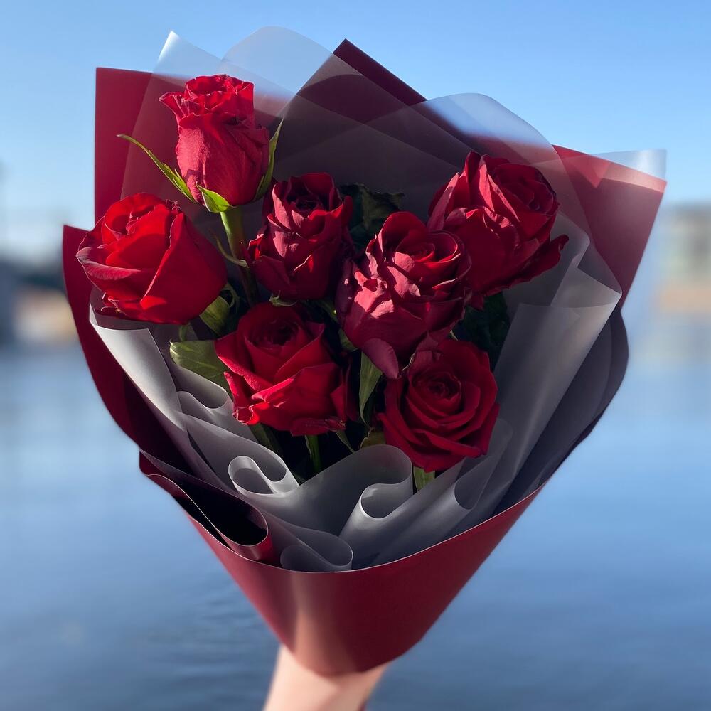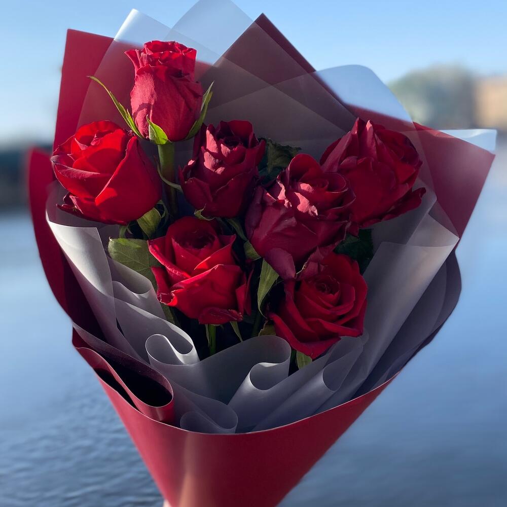 Роза – 7 шт.Упаковка – 2 шт.Лента – 2 шт.