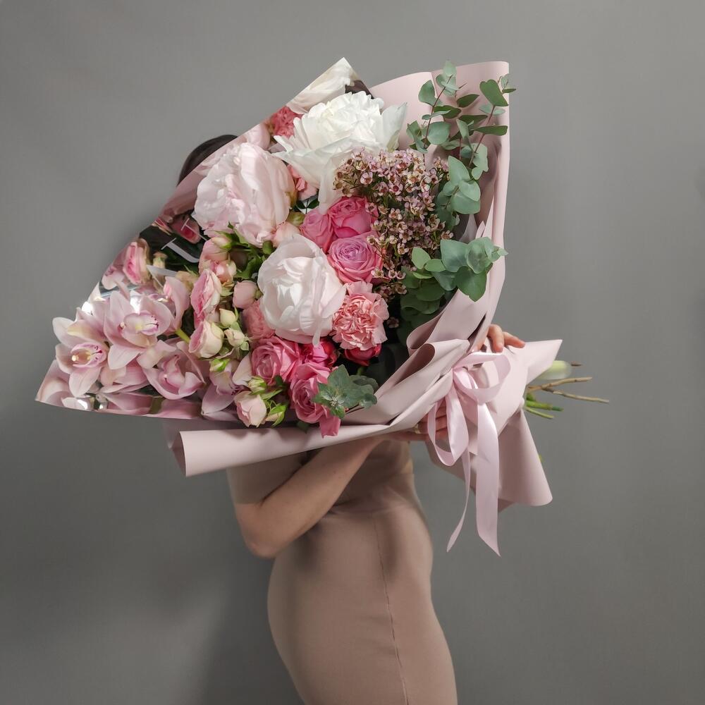 Ваксфлауэр – 1 шт.Орхидея Цимбидиум – 1 шт.Пион – 3 шт.Роза кустовая – 3 шт.Диантус – 3 шт.Аквапак – 1 шт.Дизайнерская упаковка – 1 шт.подкормка для срезанных цветов – 2 шт.