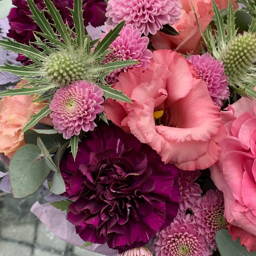 кантри блю пионовидная роза – 1 шт.диантус черничный – 2 шт.Диантус розовый – 1 шт.Лизиантус – 1 шт.Сантиния – 2 шт.Эрингиум – 1 шт.Ваксфлауэр – 1 шт.