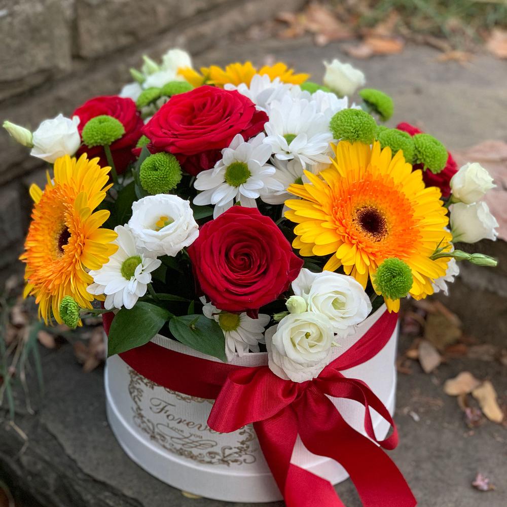 Роза красная – 3 шт. Коробка шляпная – 1 шт. Хризантема зеленая – 2 шт. Гербера желтая – 3 шт. Хризантема белая – 1 шт. эустома белая – 2 шт.