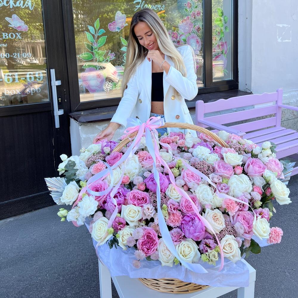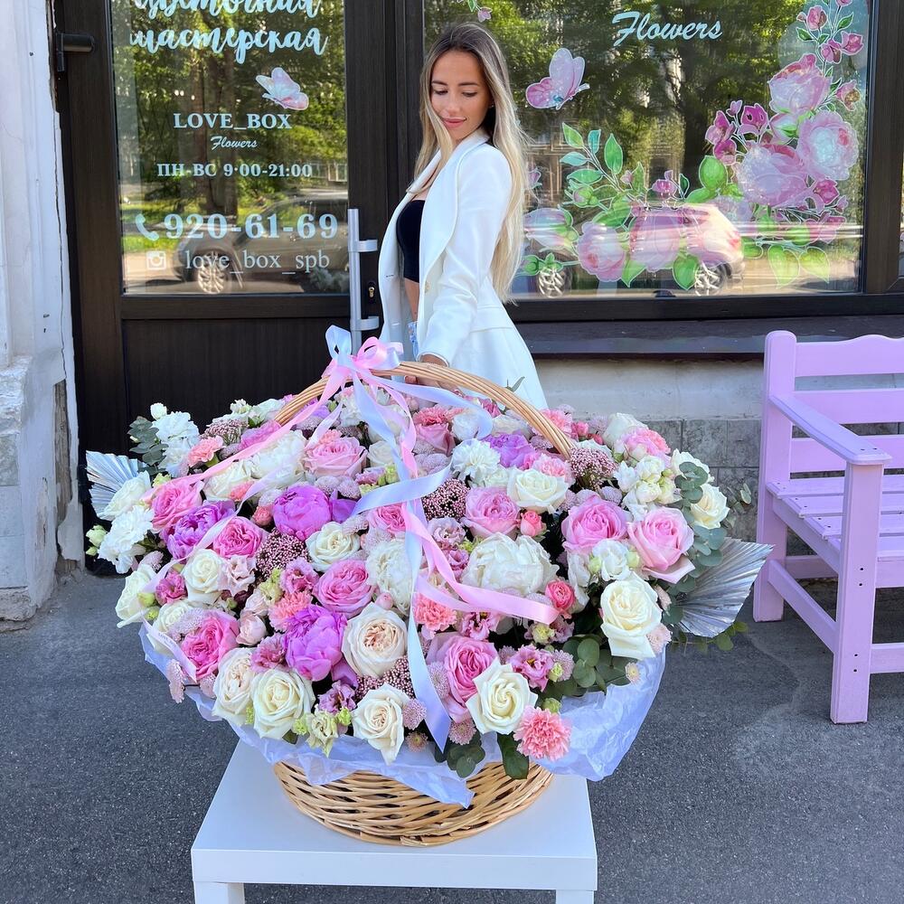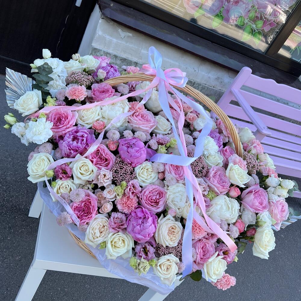 Пион – 10 шт.Пионовидная роза – 15 шт.Роза Эквадор – 25 шт.Хризантема кустовая – 10 шт.Лизиантус – 12 шт.Диантус – 12 шт.зелень декоративная – 11 шт.Корзина плетеная – 1 шт.Дизайнерская упаковка – 5 шт.