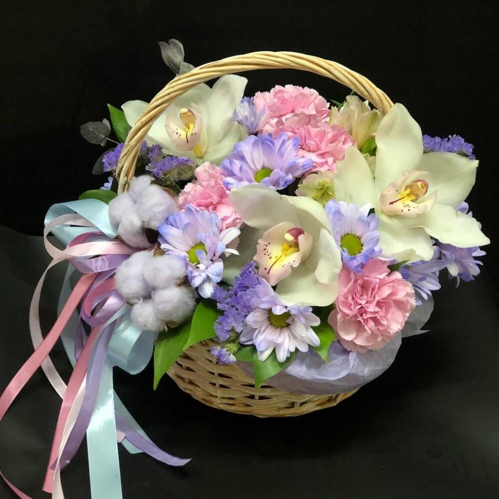 Альстромерия – 1 шт.Цимбидиум белый – 3 шт.Диантус – 4 шт.Рускус – 7 шт.Статица – 1 шт.Тюльпан – 2 шт.Хлопок – 3 шт.Роза – 2 шт.Корзина плетеная – 1 шт.Оазис флористический – 1 шт.Хризантема кустовая – 2 шт.