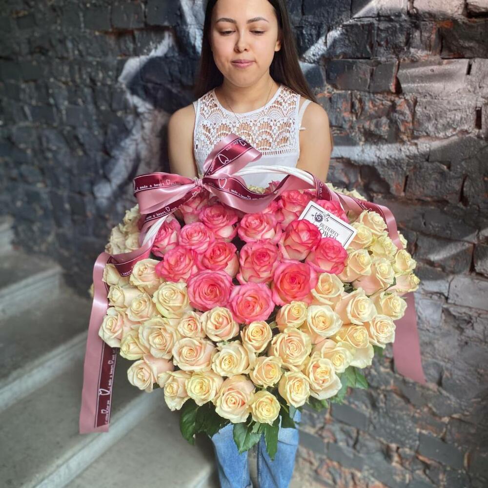 Метки: 101 роза, от 5000 руб, цветы в корзине