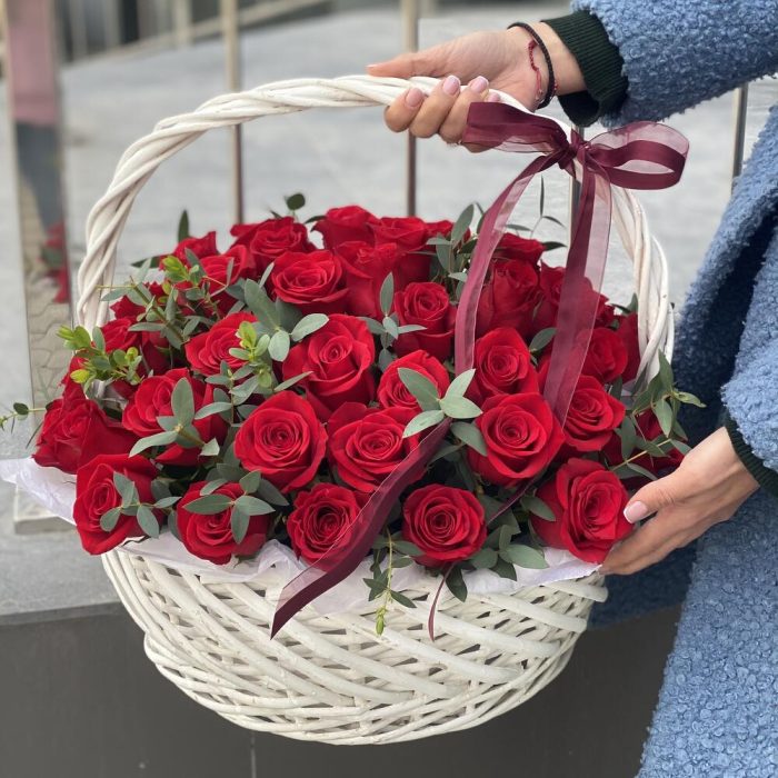 Метки: 14 февраля, 51 роза, от 5000 руб, Роза 30 см, Розы в корзине, цветы в корзине