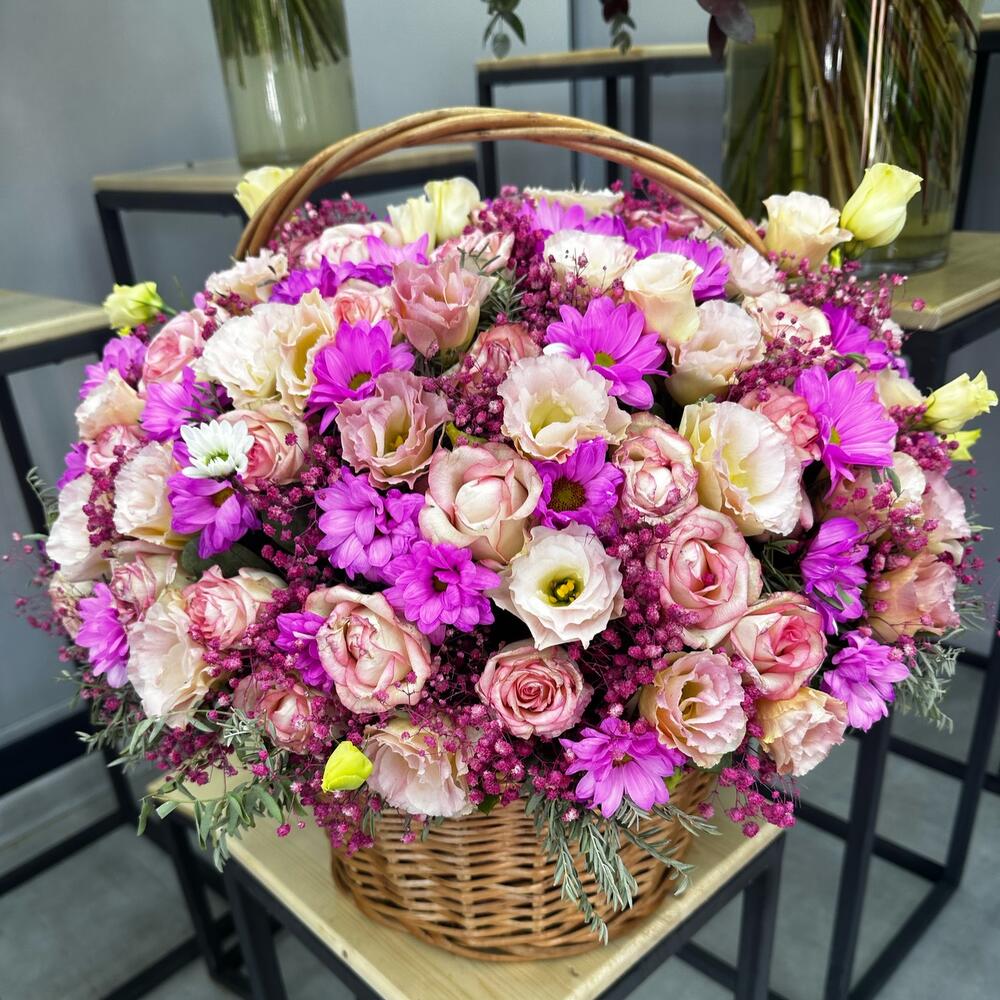 Роза – 29 шт. Хризантема – 33 шт. Эустома – 11 шт. декоративная зелень – 5 шт. Корзина плетеная – 1 шт.