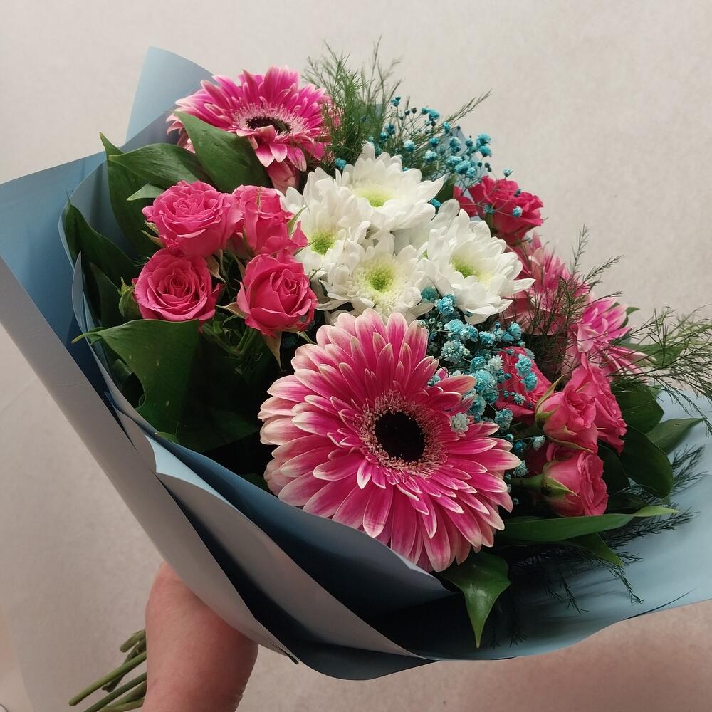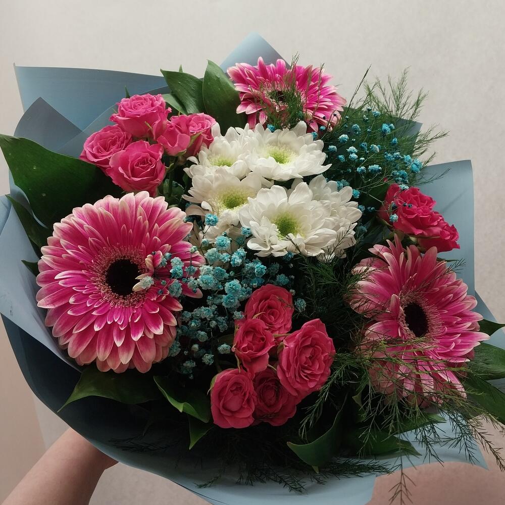 Категорий: Герберы, Гипсофила, Кустовые розы, Розы, Хризантемы