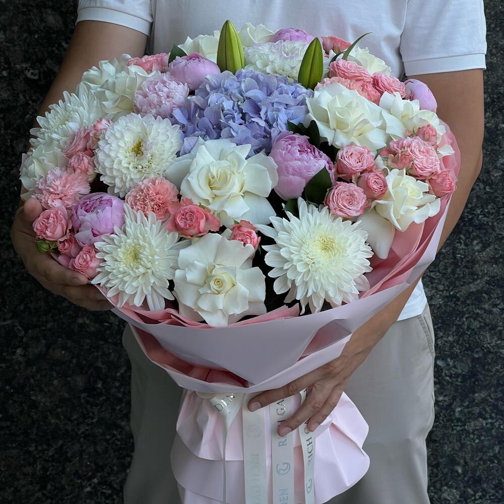 Гортензия – 1 шт. Пион Сара Бернар – 6 шт. Роза – 11 шт. спрей пионовидная роза – 7 шт. георгины – 2 шт. Хризантема одноголовая – 4 шт. Рускус – 5 шт. бумага дизайнерская – 1 шт. Диантус – 3 шт. Лилия – 1 шт.