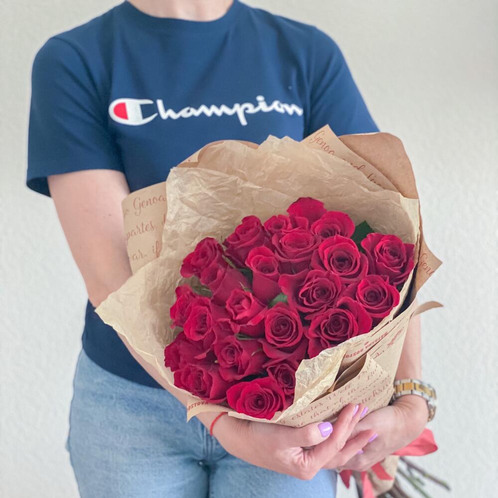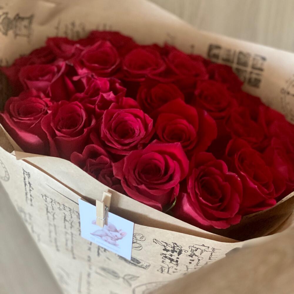 Лента атласная – 1 шт.Крафт упаковка – 4 шт.красная эквадор роза 50 см – 25 шт.