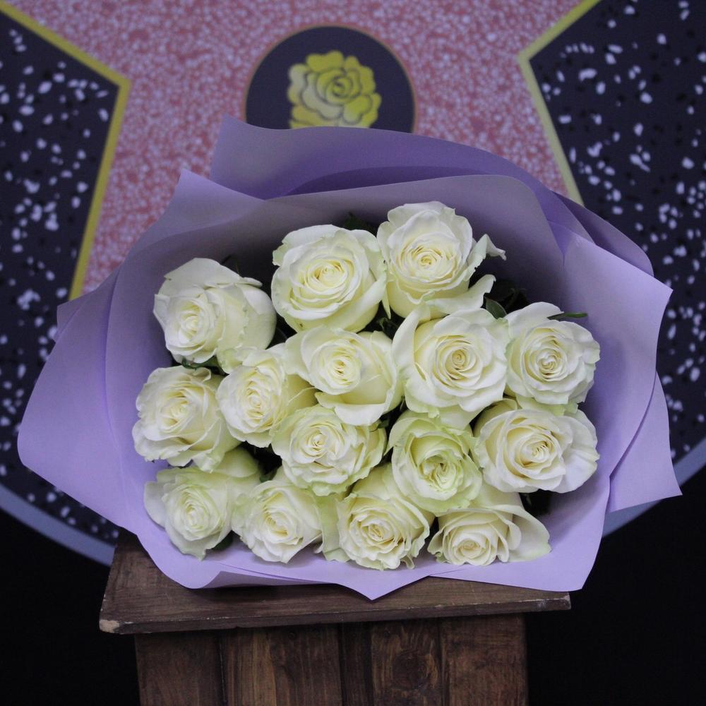 Роза Мондиаль – 15 шт.Пленка дизайнерская – 3 шт.Лента атласная – 1 шт.