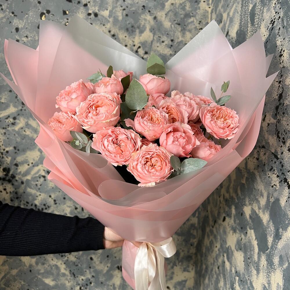 mono bouquet 145 из 5 кустовых пионовидных роз сорта Julietta с эвкалиптом