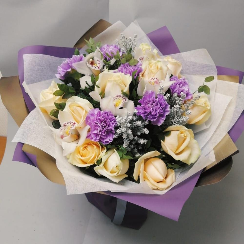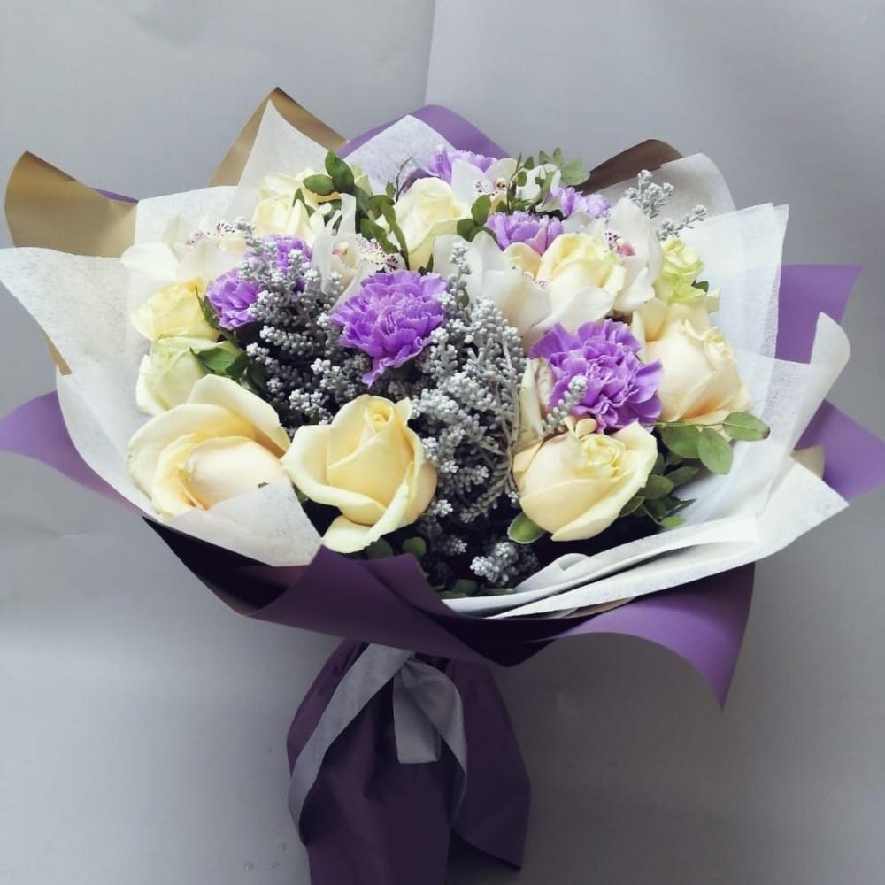 Роза кремовая – 11 шт.Гвоздика сиреневая – 6 шт.декор ветки – 3 шт.Черничник – 3 шт.Пленка дизайнерская – 3 шт.Лента атласная – 1 шт.