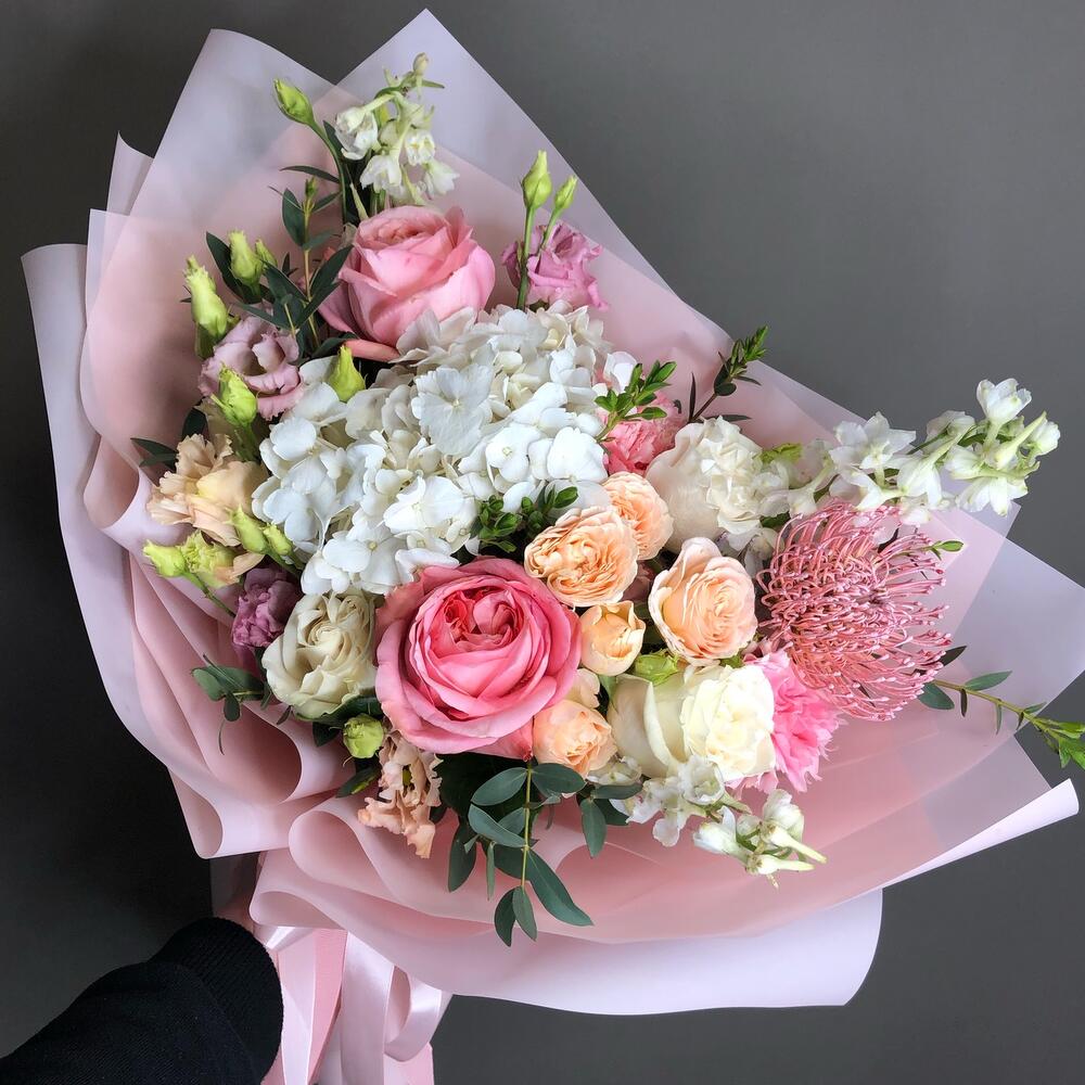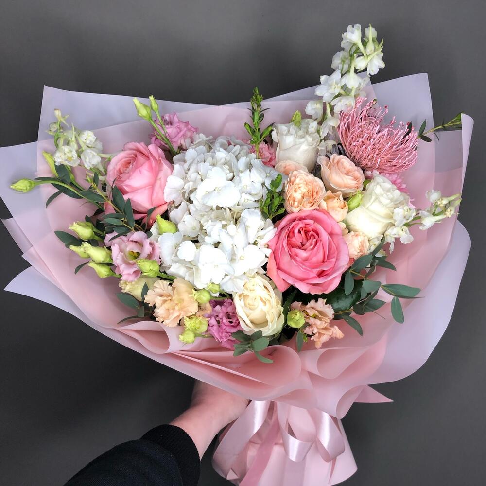 Гортензия белая – 1 шт.Дельфиниум белый – 3 шт.роза пионовидная пинк экспрешн – 2 шт.Роза Венделла – 3 шт.Кустовая роза – 1 шт.Эустома – 2 шт.леукоспермум розовый – 1 шт.Диантус – 3 шт.эвкалипт итальянский – 4 шт.Пленка матовая – 6 шт.Лента – 3 шт.