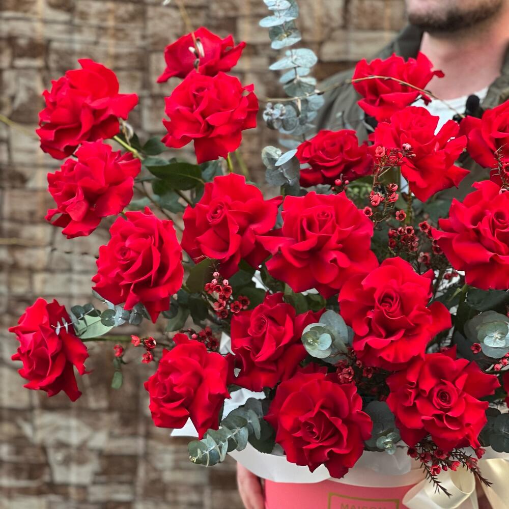 Шикарнейшая композиция из красных голландских роз в сочетании с эвкалиптом, хамелациумом и различной зеленью очарует и поразит кого угодно