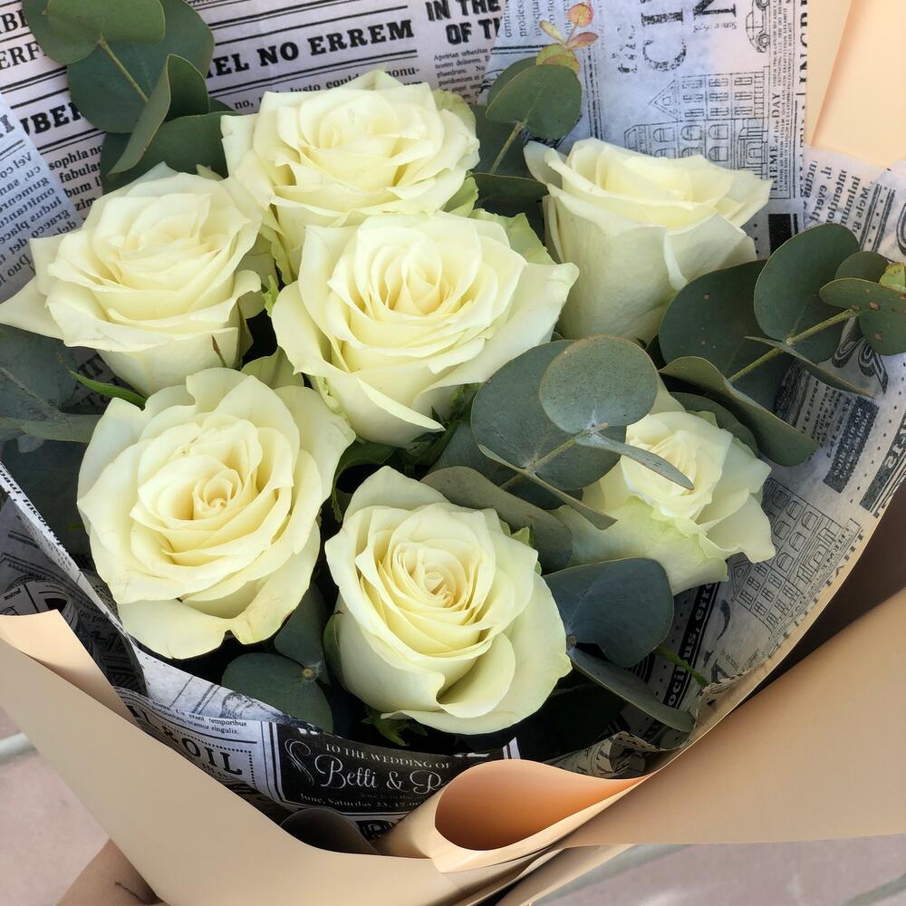 Белые кенийские розы с веточками эвкалипта в стильном оформлении.