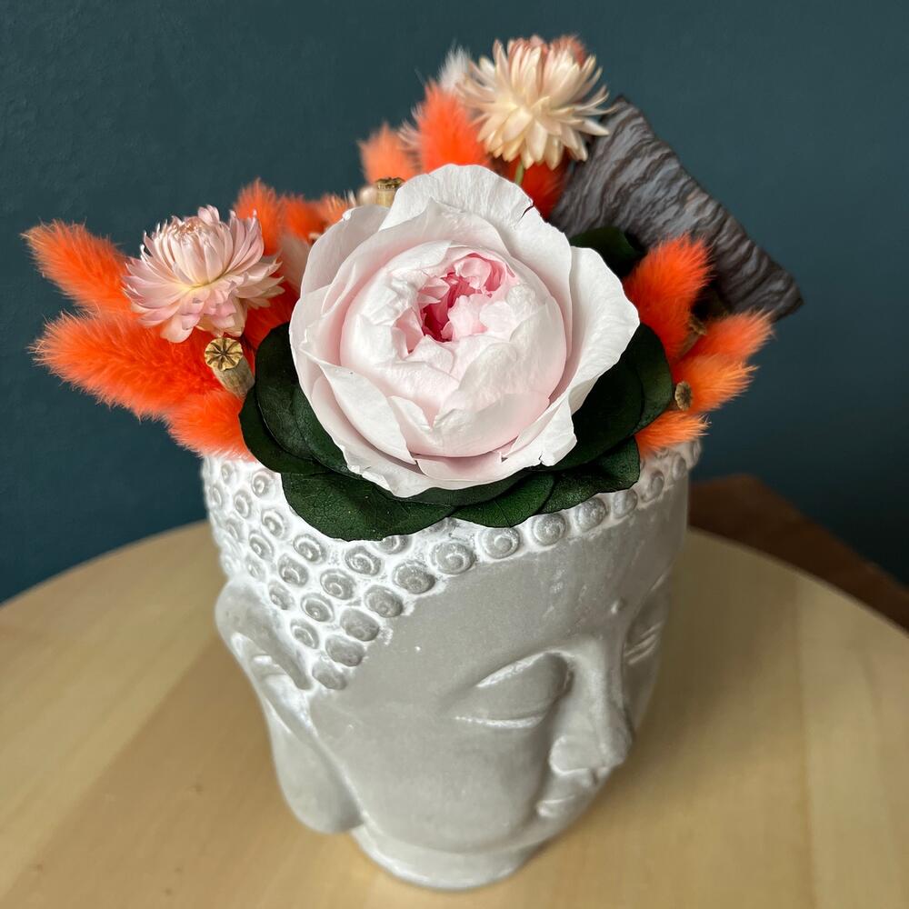 Это не просто букет цветов. А композиция, которая несет в себе философию, что наша жизнь цикличнаПионовидная роза – как распускающийся цветущий лотос А рядом с ней уже сухоцветный лотос, который уже отцвел, но в нем хранятся семена, которые в дальнейшем дадут жизнь новым цветкамЯркий оранжевый лагурус символизирует оранжевое одеяние Будды——————————————————Роза в композиции настоящая, прошедшая специальную обработку стабилизацииБукет из сухоцветов и стабилизированных цветов не завянет, а будет радовать несколько летСухоцветы не требуют трепетного ухода, ведь им не нужна вода, они не притягивают пыль, и сами не осыпаютсяК букету прилагается памятка, как сохранить внешний вид букета на несколько лет
