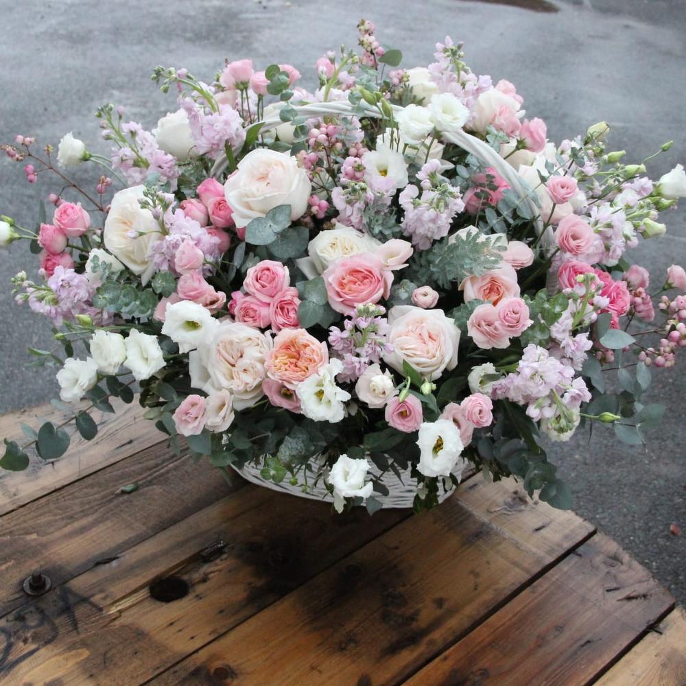 Роскошная корзина, с пионовидными розами, ароматными маттиолами, лизиантусом, кустовыми розами, эвкалиптом и снежноягодником.Стильное цветочное решение длялюбого случая.