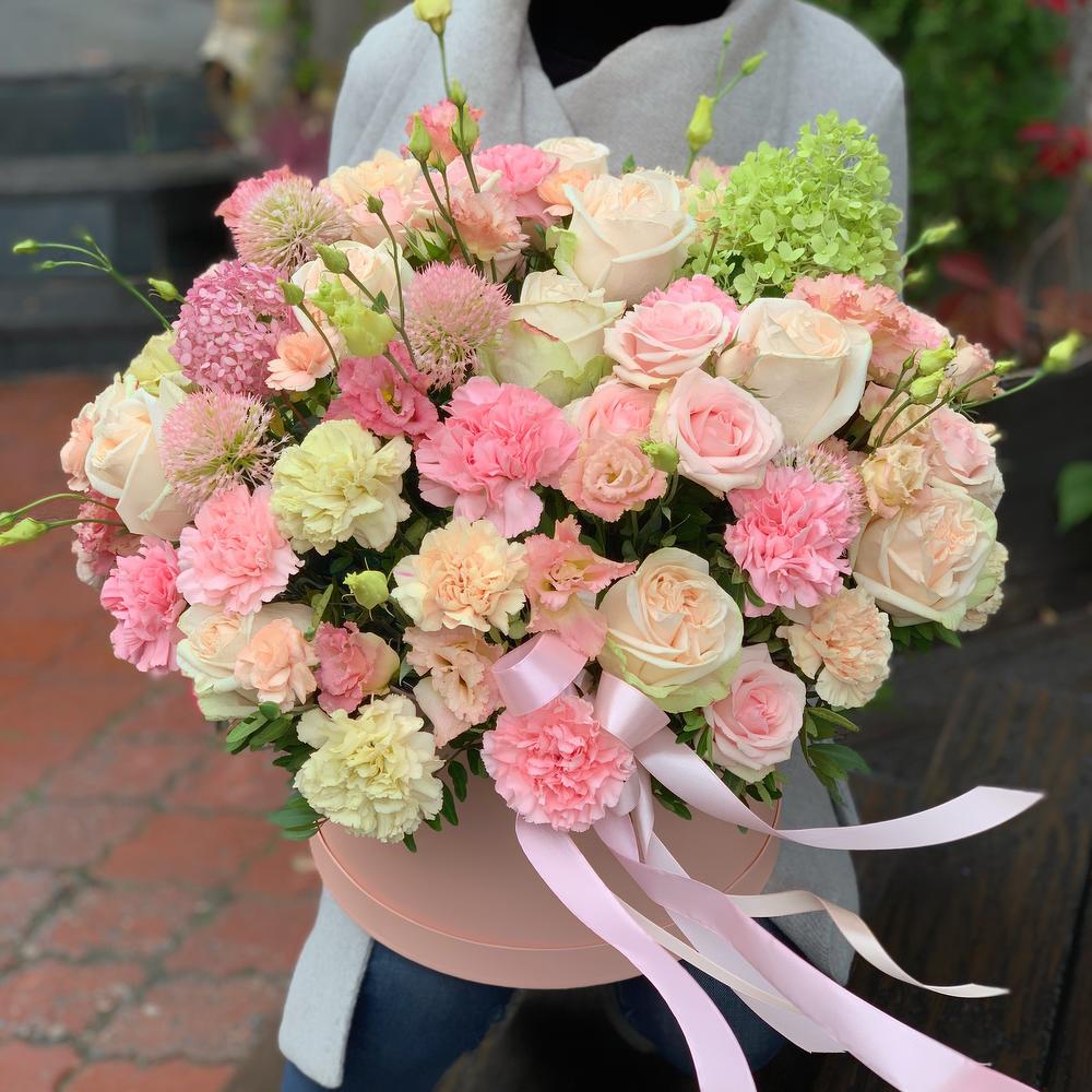 Роза кустовая – 5 шт.Лента атласная – 3 шт.Диантус – 23 шт.Коробка шляпная – 1 шт.Фисташка – 10 шт.Роза пионовидная – 11 шт.Диантус кустовой – 3 шт.Лизиантус розовый – 8 шт.Декоративные цветы – 5 шт.Оазис флористический – 3 шт.