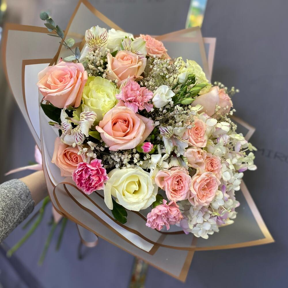 Роза – 8 шт.Эустома – 1 шт.Кустовая роза – 2 шт.Гортензия – 1 шт.Гвоздика кустовая – 1 шт.Ранункулюс – 1 шт.Альстромерия – 4 шт.Гвоздика – 2 шт.Гипсофила – 3 шт.