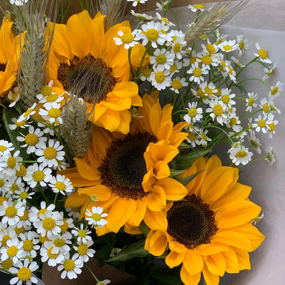 Подсолнух – 5 шт.Ромашка кустовая – 15 шт.Сухоцвет – 7 шт.Упаковка крафт дизайнерский – 1 шт.