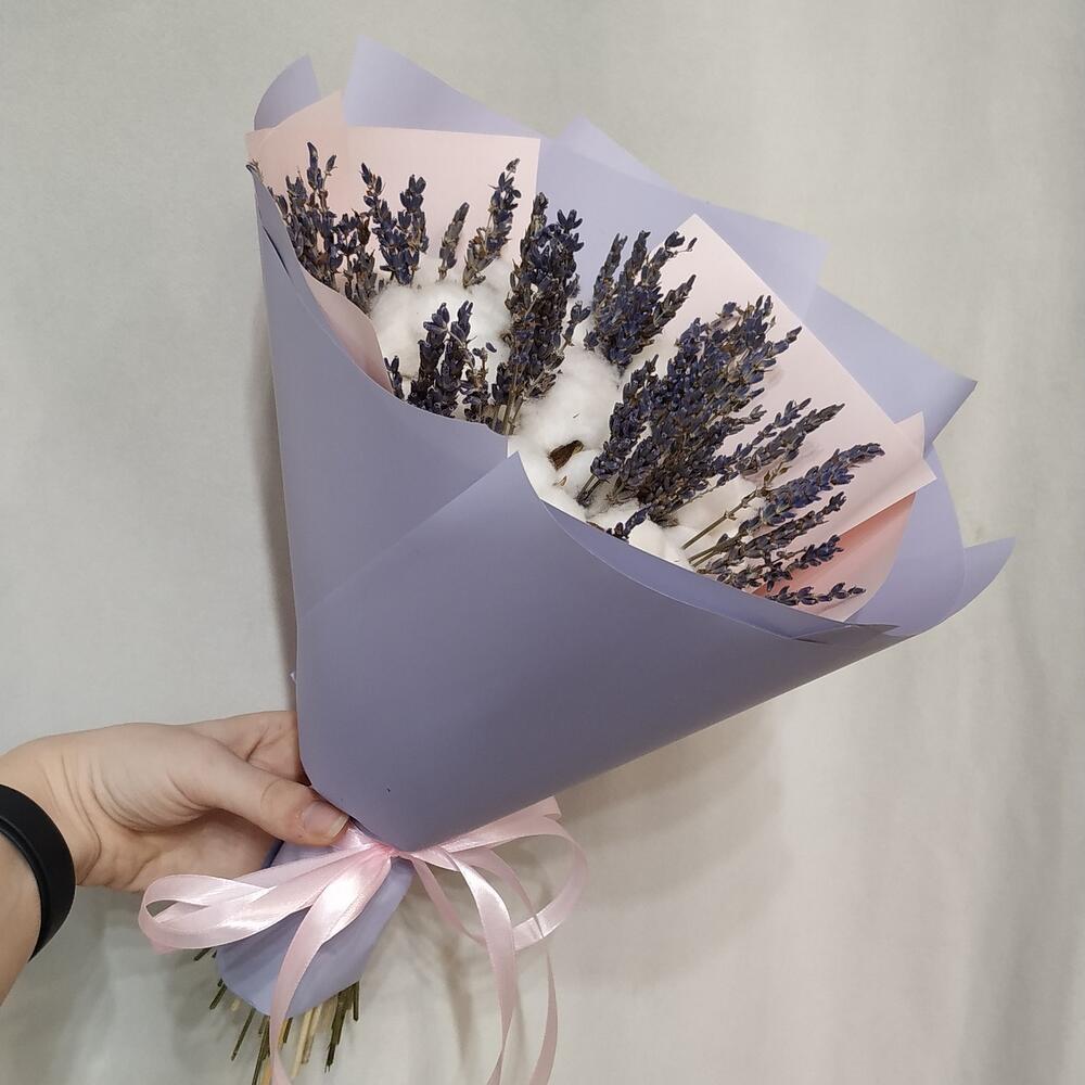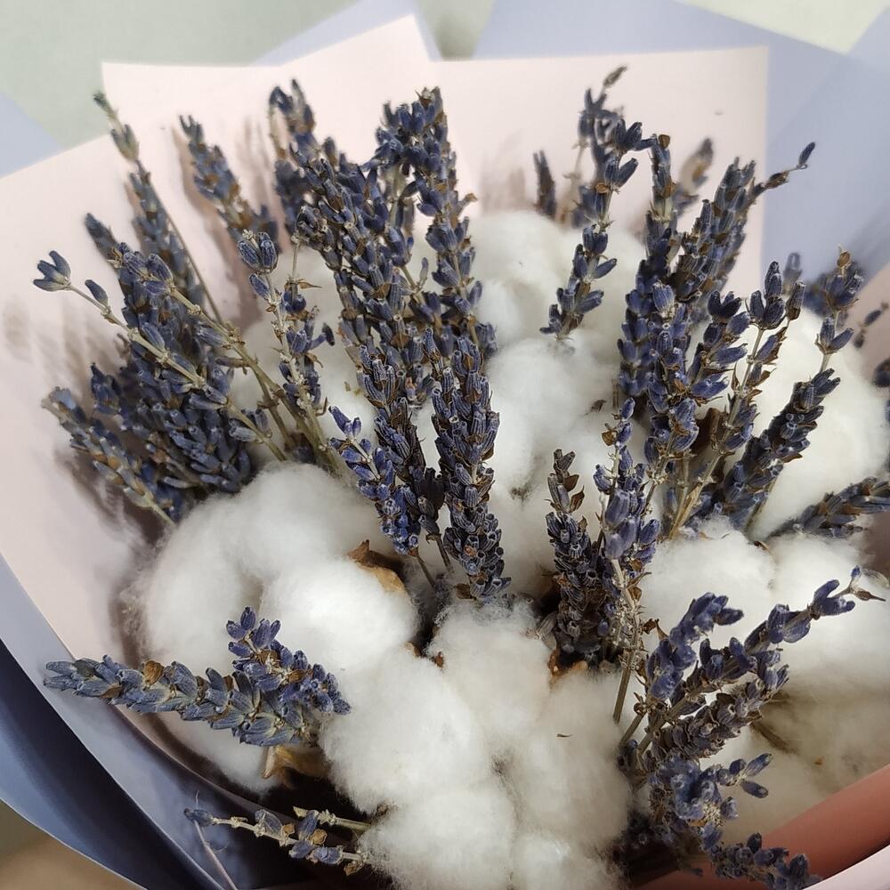 Невесомый букет из натурального хлопка и ароматной лаванды станет нежным украшением на долгое время.