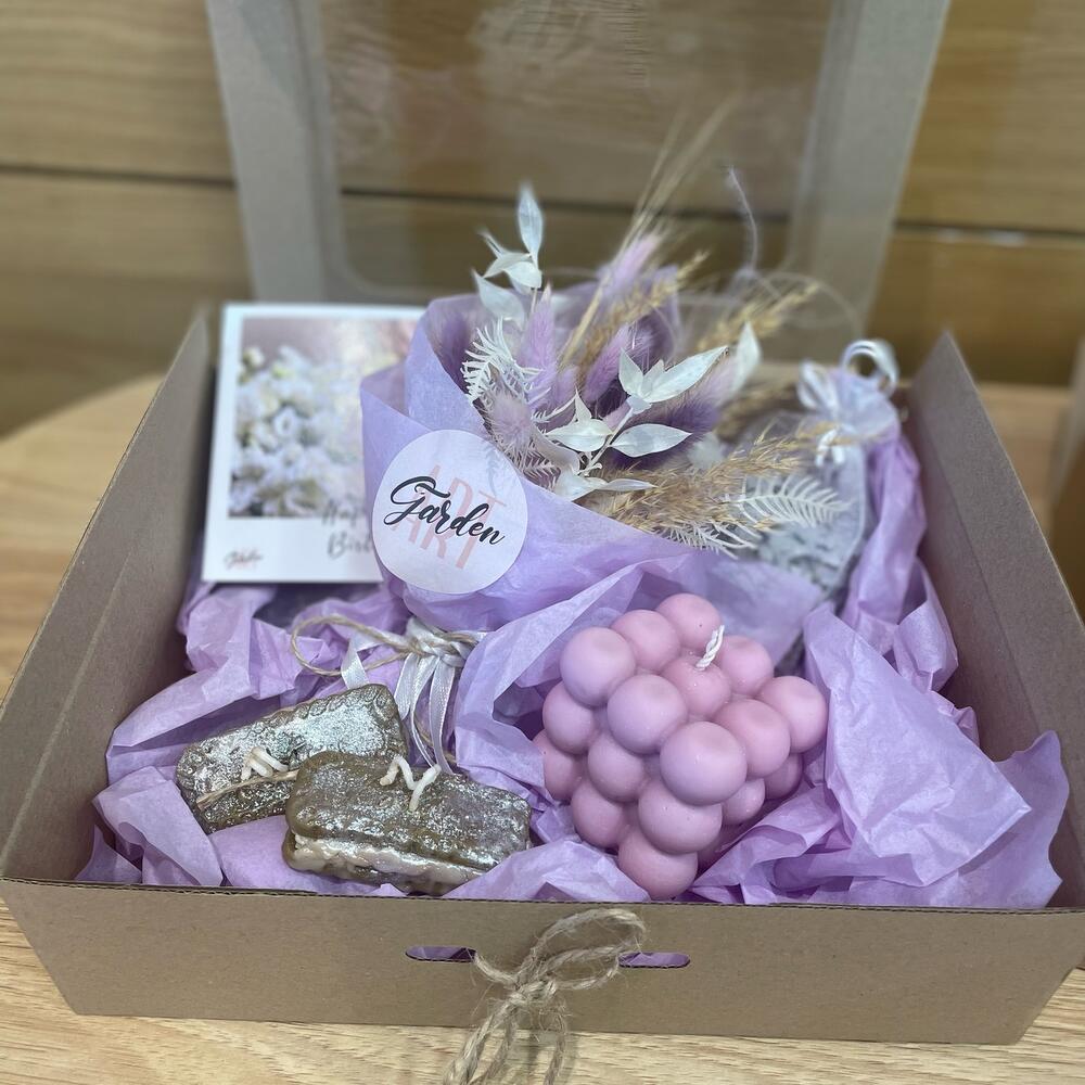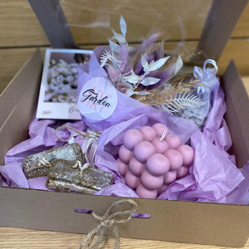 букет из сухоцветов – 1 шт.свеча шоколадное печенье – 2 шт.свеча пузыри – 1 шт.аромасаше с лавандой – 1 шт.Открытка – 1 шт.Коробка – 1 шт.