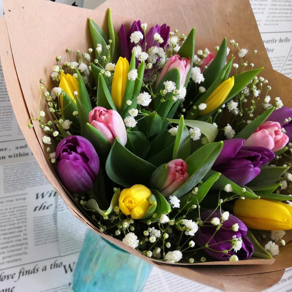 15 разноцветных тюльпанов в крафте