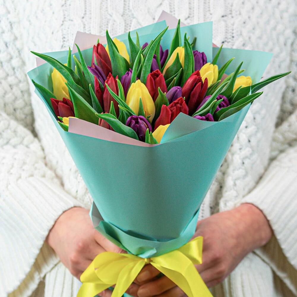 Букет из 25 тюльпанов стандарт яркий микс в упаковке