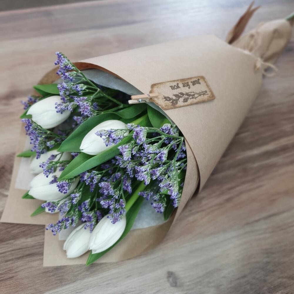 Тюльпан – 7 шт.Лимониум – 1 шт.Упаковка дизайнерская – 2 шт.
