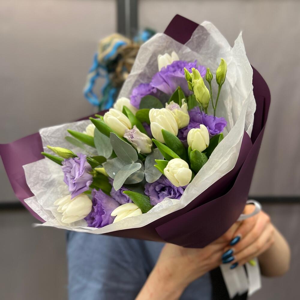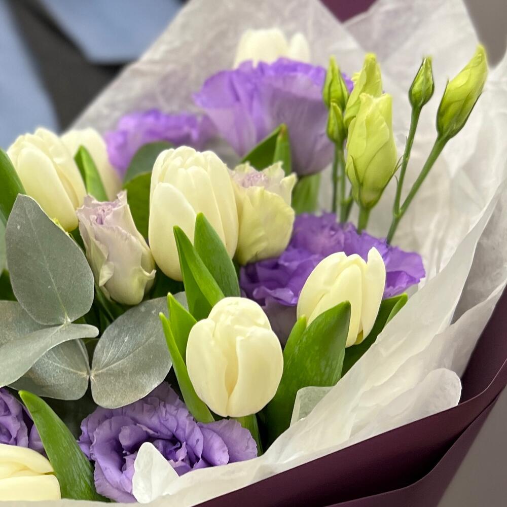 Тюльпан – 9 шт.эустома махровая – 2 шт.Эвкалипт – 1 шт.Тишью – 2 шт.Пленка матовая – 2 шт.Лента атласная – 2 шт.