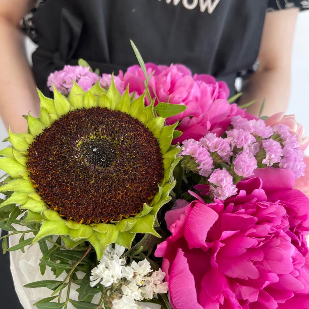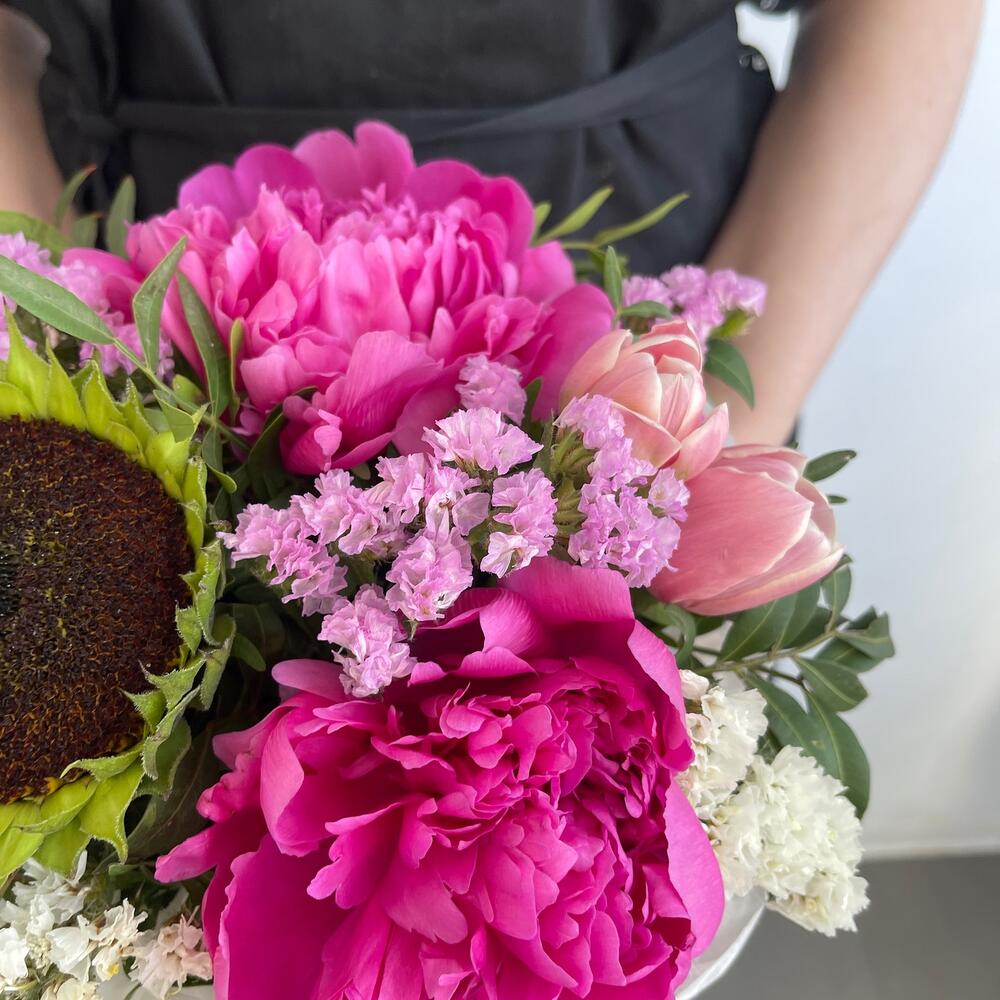 Пион – 2 шт.Тюльпан – 2 шт.Статица – 3 шт.Подсолнух – 1 шт.Тишью – 1 шт.Фисташка – 4 шт.Коробка шляпная – 1 шт.Оазис – 1 шт.