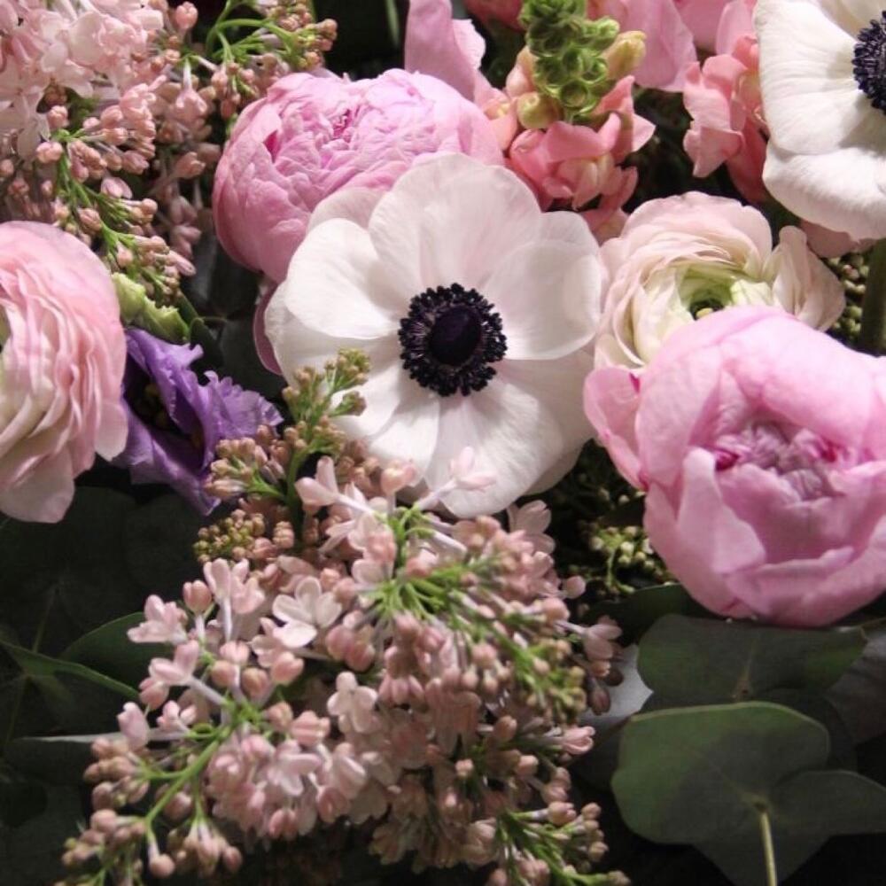 Анемон – 3 шт.Антуриум – 2 шт.Дельфиниум – 2 шт.Корзина – 1 шт.Лизиантус – 7 шт.Маттиола – 11 шт.Пион – 5 шт.Сирень – 3 шт.Хедера – 5 шт.Эвкалипт – 11 шт.Ранункулюс – 3 шт.Аллиум – 2 шт.Львиный зев – 3 шт.Тюльпан сортовой – 11 шт.Молюцелла – 2 шт.Ветви – 3 шт.