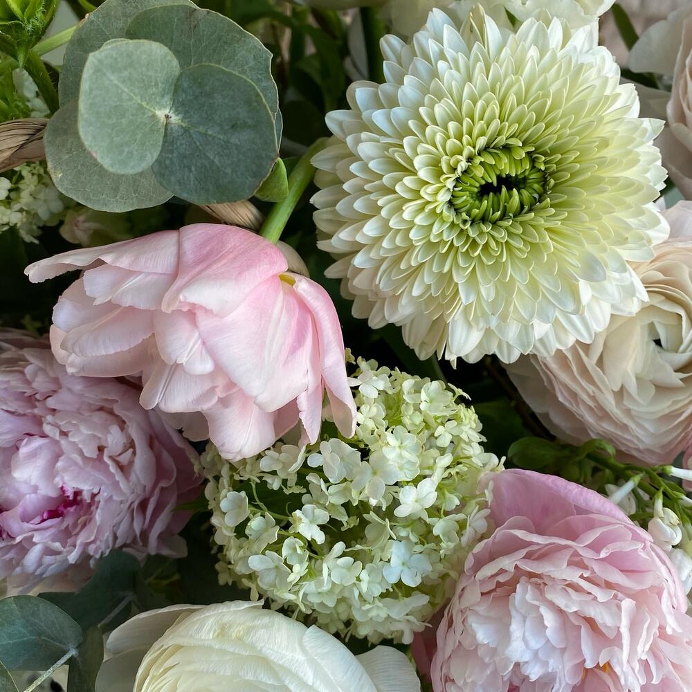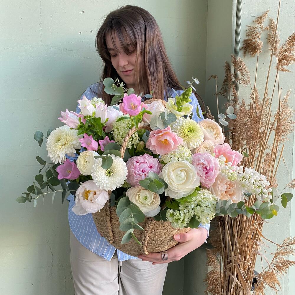 Вибурнум – 3 шт.Пион – 7 шт.Сирень – 3 шт.Тюльпан – 9 шт.Эвкалипт – 7 шт.Гербера – 3 шт.Ранункулюс – 5 шт.Корзина плетеная – 1 шт.Львиный зев – 3 шт.Колокольчик – 2 шт.Оазис флористический – 2 шт.